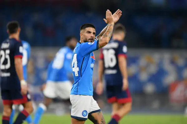 NAPLES, ITALY - SEPTEMBER 26: Lorenzo Insigne of SSC Napoli greets his supporters during the Serie A match between SSC Napoli and Cagliari Calcio at Stadio Diego Armando Maradona on September 26, 2021 in Naples, Italy. (Photo by Francesco Pecoraro/Getty Images)