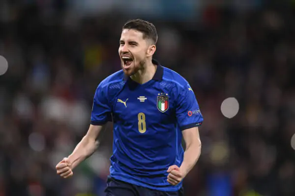 Photo LaPresse - Fabio Ferrari July 06, 2021 London, Great Britain soccer Italy vs Spain - Euro 2020 - European Football Championship - Semi-Final -Wembley Stadium of London. In the pic: Frello Jorge Luiz Jorginho Italy celebrates PUBLICATIONxNOTxINxITAxFRAxCHN Copyright: xFabioxFerrari/LaPressex