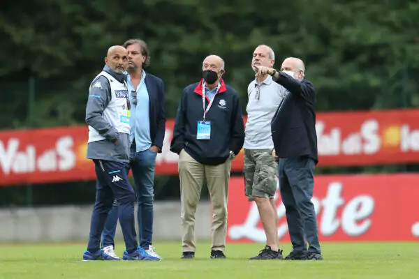 Italy: Preseason 2020-21 SSC Napoli Dimaro Folgarida SSC Napoli s Italian coach Luciano Spalletti R, SSC Napoli s Italian sports director Cristiano Giuntoli, medical consultant Raffaele Landolfi, SSC Napoli s Italian managing director Andrea Chiavelli, SSC Napoli s President Aurelio De Laurentiis L, during the first day of ssc napoli s 2020-21 pre-season training camp in val di sole in trentino, dimaro folgarida ABPH6712 Copyright: xAntonioxBalascox