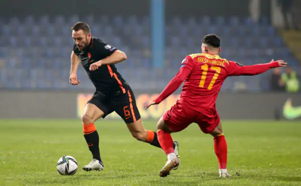 PODGORICA, MONTENEGRO - NOVEMBER 13: Stefan de Vrij of Netherlands during the 2022 FIFA World Cup Qualifier match between Montenegro and Netherlands at Gradski Stadion on November 13, 2021 in Podgorica, Montenegro. (Photo by Filip Filipovic/Getty Images)
