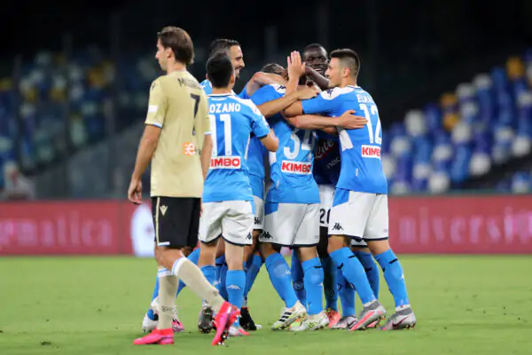 NAPLES, ITALY - JUNE 28: SSC Napoli players celebrate the 3-1 goal scored by Amin Younes, beside the disappointment of Simone Missiroli of SPAL during the Serie A match between SSC Napoli and SPAL at Stadio San Paolo on June 28, 2020 in Naples, Italy. (Photo by Francesco Pecoraro/Getty Images)