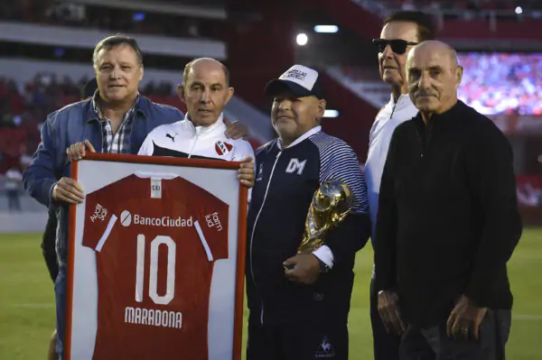 BUENOS AIRES, ARGENTINA - FEBRUARY 22: (L-R) Daniel Bertoni, Ricardo Bochini Diego Maradona, Miguel Santoro and Ricardo Pavoni pose for the photo prior a match between Independiente and Gimnasia y Esgrima La Plata as part of Superliga 2019/20 at Estadio Libertadores de America on February 22, 2020 in Buenos Aires, Argentina. (Photo by Marcelo Endelli/Getty Images)
