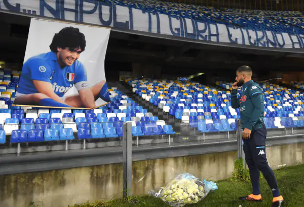 NAPLES, ITALY - NOVEMBER 29: Lorenzo Insigne of S.S.C. Napoli places tributes next to a banner showing an images of the deceased Diego Maradona during the Serie A match between SSC Napoli and AS Roma at Stadio San Paolo on November 29, 2020 in Naples, Italy. Sporting stadiums around Italy remain under strict restrictions due to the Coronavirus Pandemic as Government social distancing laws prohibit fans inside venues resulting in games being played behind closed doors. (Photo by Francesco Pecoraro/Getty Images)