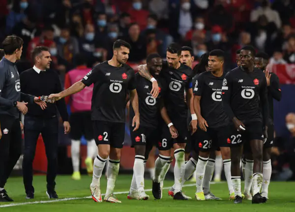 SEVILLE, SPAIN - NOVEMBER 02: Jonathan Ikone (2.L) of Lille OSC celebrates with teammates L.R) Zeki Celik, Jose Fonte, Reinildo and Timothy Weah after scoring their team's 2nd goal during the UEFA Champions League group G match between Sevilla FC and Lille OSC at Estadio Ramon Sanchez Pizjuan on November 02, 2021 in Seville, Spain. (Photo by Denis Doyle/Getty Images)