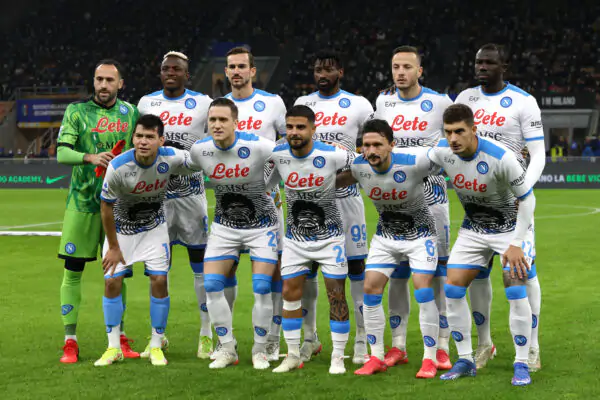 MILAN, ITALY - NOVEMBER 21: SSC Napoli players pose for aa team group during the Serie A match between FC Internazionale and SSC Napoli at Stadio Giuseppe Meazza on November 21, 2021 in Milan, Italy. (Photo by Marco Luzzani/Getty Images)