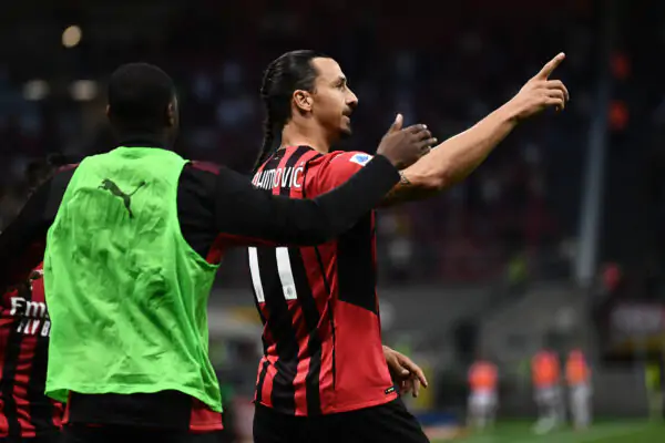 210912 Zlatan Ibrahimovic of Milan celebrates scoring 2-0 during the Serie A football match between Milan and Lazio on September 12, 2021 in Milan. Photo: Matteo Gribaudi / BILDBYRAN / Cop 290 fotboll football soccer seria a milan lazio bbeng jubel *** 210912 Zlatan Ibrahimovic of Milan celebrates scoring 2 0 during the Serie A football match between Milan and Lazio on September 12, 2021 in Milan Photo Matteo Gribaudi BILDBYRAN Cop 290 fotboll football soccer seria a milan lazio bbeng jubel, PUBLICATIONxNOTxINxSWExNORxAUT Copyright: MATTEOxGRIBAUDI BB210912ZN026