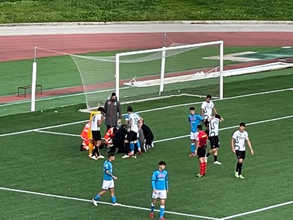 55′ – Uno due stretto in area tra Vergara e Ambrosino. Il numero 10 del Napoli tenta il tiro a giro, ma la palla vinee respinta in calcio d’angolo. Dal corner successivo Costanzo nel tentativo di prendere la palla, colpisce in pieno volto Pelamatti che cade a terra. Attimi di panico allo stadio Piccolo.