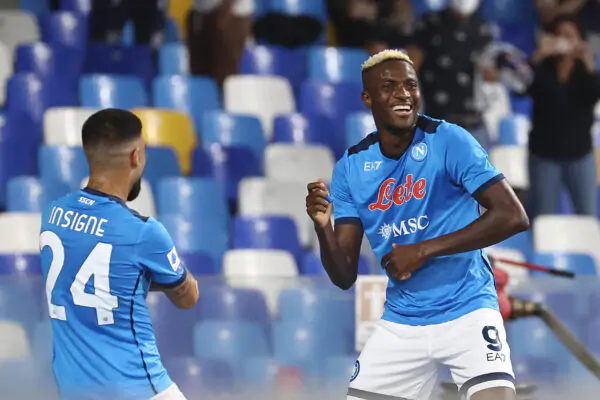 NAPLES, ITALY SEPTEMBER 26: Victor Osimhen of SSC Napoli celebrates with Lorenzo Insigne of SSC Napoli during the Serie A match between SSC Napoli and Cagliari Calcio at Stadio Diego Armando Maradona on September 26 2021 in Naples, Italy Copyright: xFOTOAGENZIAx