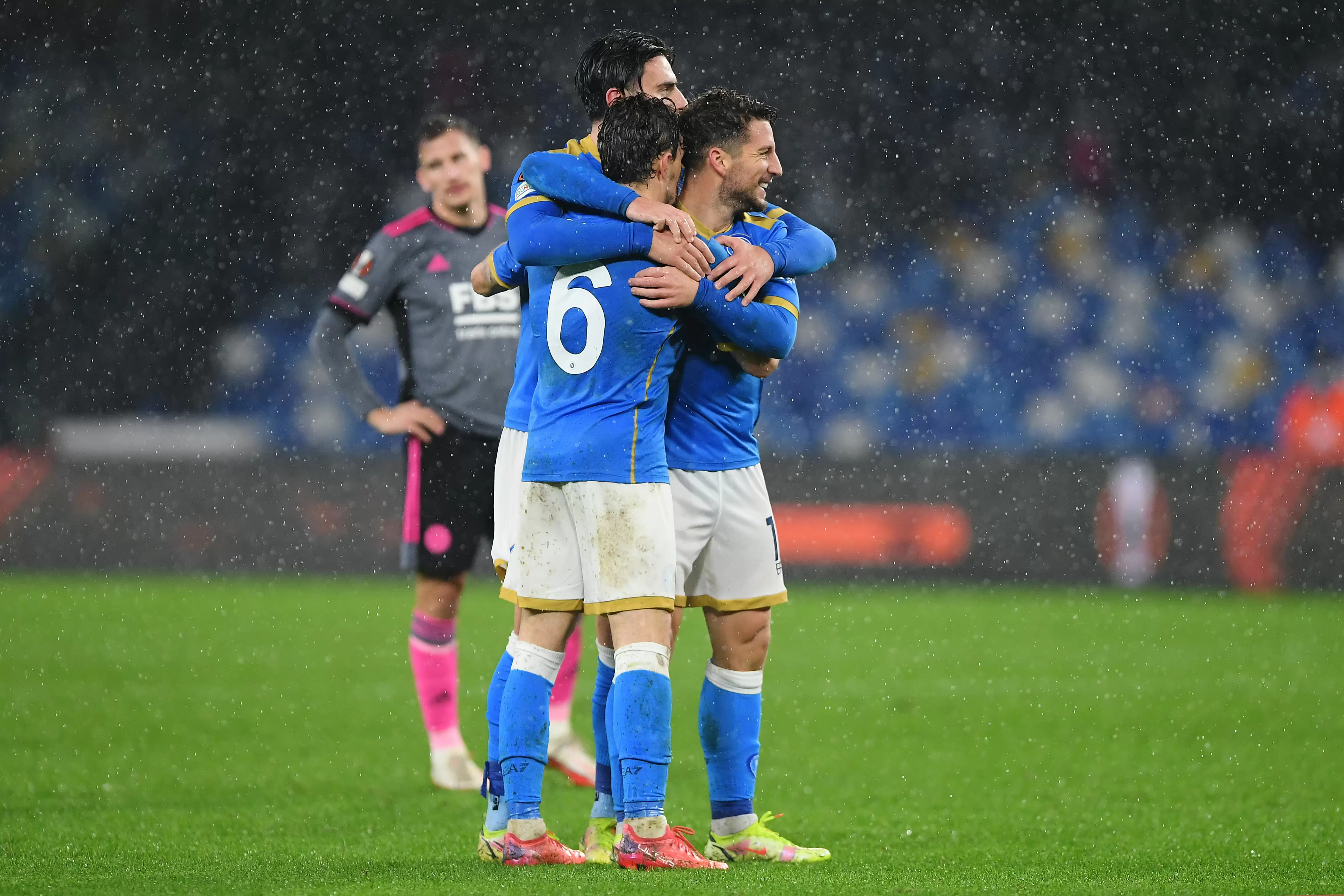 NAPLES, ITALY - DECEMBER 09: Mario Rui, Dries Mertens and Eljif Elmas of SSC Napoli celebrate after their sides victory in the UEFA Europa League group C match between SSC Napoli and Leicester City at Stadio Diego Armando Maradona on December 09, 2021 in Naples, Italy. (Photo by Francesco Pecoraro/Getty Images)