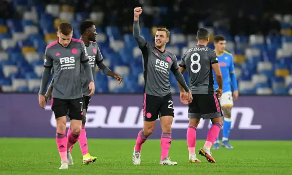NAPLES, ITALY - DECEMBER 09: Kiernan Dewsbury-Hall of Leicester City celebrates after scoring their team's second goal during the UEFA Europa League group C match between SSC Napoli and Leicester City at Stadio Diego Armando Maradona on December 09, 2021 in Naples, Italy. (Photo by Francesco Pecoraro/Getty Images)