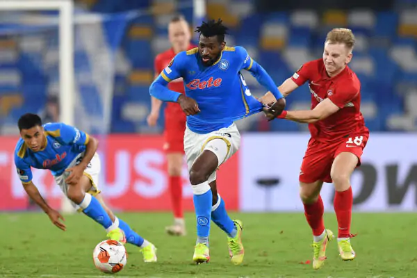 NAPLES, ITALY - SEPTEMBER 30: Andre Zambo Anguissa of SSC Napoli vies with Nail Umyarov of Spartak Moskva during the UEFA Europa League group C match between SSC Napoli and Spartak Moskva at Stadio Diego Armando Maradona on September 30, 2021 in Naples, Italy. (Photo by Francesco Pecoraro/Getty Images)