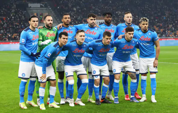 MILAN, ITALY - DECEMBER 19: The SCC Napoli team line up prior to the Serie A match between AC Milan and SSC Napoli at Stadio Giuseppe Meazza on December 19, 2021 in Milan, Italy. (Photo by Marco Luzzani/Getty Images)