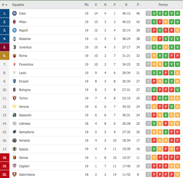 Le cause possono derivare dalla sfilza di infortuni importanti, da un po’ di sfortuna ma anche da un po’ di carenza che li ha portati a perdere un bel po’ di punti tra novembre e dicembre. Infatti, ora la classifica parla chiaro e vede in pole position l’Inter a quota 46 punti, per poi trovare ancora sul podio il Milan a 42 e il Napoli a 39. Ma occhio ancora all’Atalanta che dista solamente di un punto dai partenopei, mentre in attesa di un posto sul podio c’è la Juventus a 34 punti.
