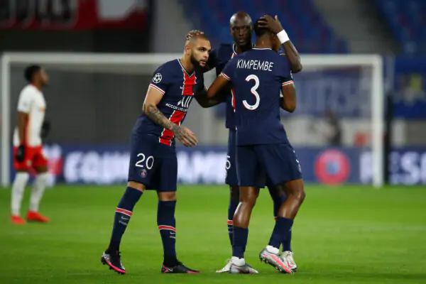 LEIPZIG, GERMANY - NOVEMBER 04: Danilo Pereira of Paris Saint-Germain interacts with Layvin Kurzawa of Paris Saint-Germain and Presnel Kimpembe of Paris Saint-Germain during the UEFA Champions League Group H stage match between RB Leipzig and Paris Saint-Germain at Red Bull Arena on November 04, 2020 in Leipzig, Germany. Sporting stadiums around Germany remain under strict restrictions due to the Coronavirus Pandemic as Government social distancing laws prohibit fans inside venues resulting in games being played behind closed doors. (Photo by Maja Hitij/Getty Images)