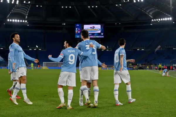 ROME, ITALY - DECEMBER 17: Francesco Acerbi of SS Lazio celebrates after scoring the second goal of his team with his teammate during the Serie A match between SS Lazio and Genoa CFC at Stadio Olimpico on December 17, 2021 in Rome, Italy. (Photo by Marco Rosi - SS Lazio/Getty Images)