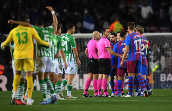 BARCELONA, SPAIN - DECEMBER 04: Sergino Dest, Jordi Alba, Luuk de Jong and Frenkie de Jong of FC Barcelona complain to Referee Pablo Gonzalez Fuertes after the La Liga Santander match between FC Barcelona and Real Betis at Camp Nou on December 04, 2021 in Barcelona, Spain. (Photo by Alex Caparros/Getty Images)