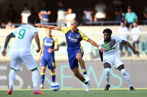 VERONA, ITALY - AUGUST 21: Antonin Barak of Hellas Verona competes for the ball with Jeremie Boga of US Sassuolo during the Serie A match between Hellas Verona FC v US Sassuolo at Stadio Marcantonio Bentegodi on August 21, 2021 in Verona, Italy. (Photo by Alessandro Sabattini/Getty Images)