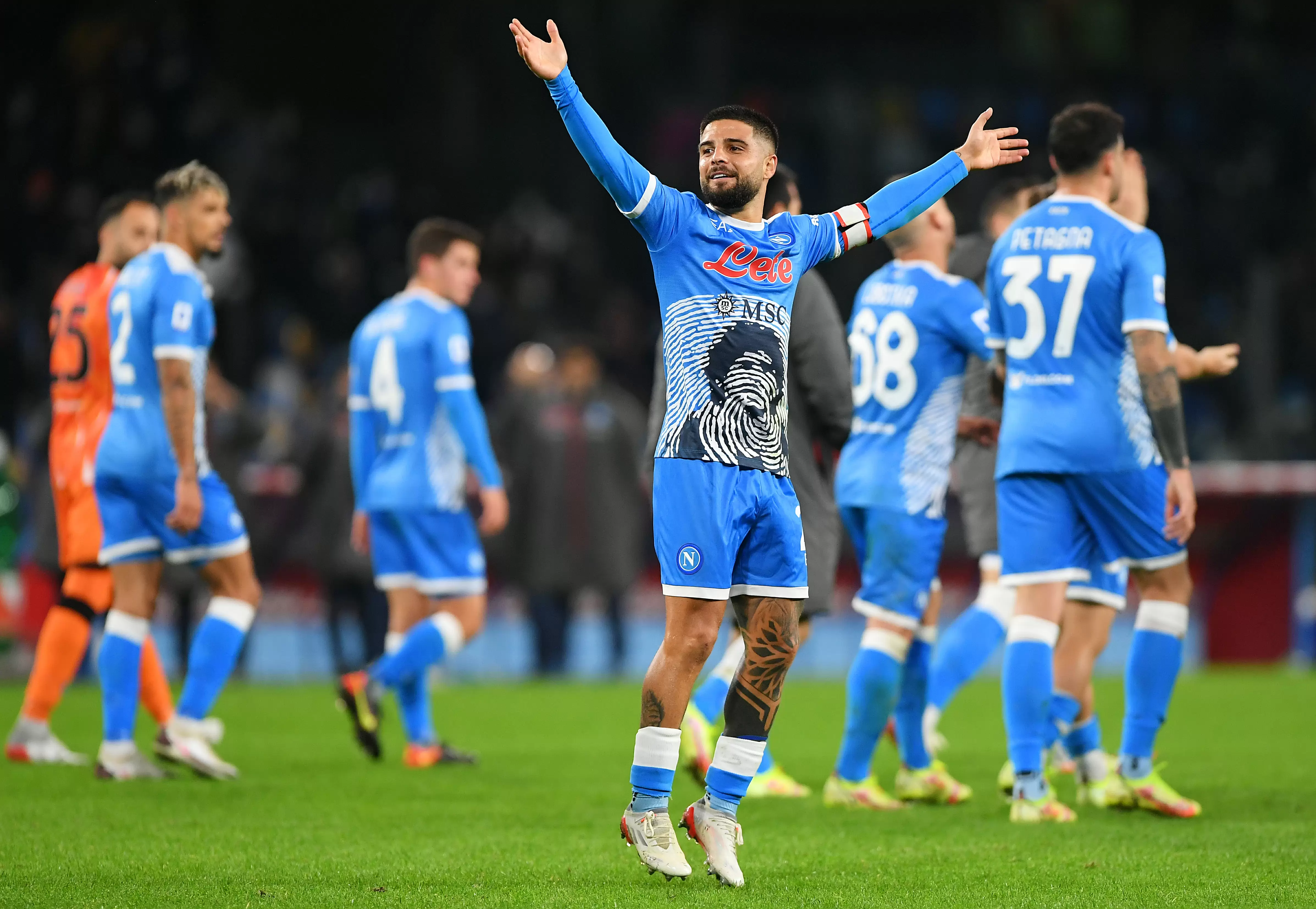 NAPLES, ITALY - NOVEMBER 28: Lorenzo Insigne of SSC Napoli celebrates their side's victory after the Serie A match between SSC Napoli and SS Lazio at Stadio Diego Armando Maradona on November 28, 2021 in Naples, Italy. (Photo by Francesco Pecoraro/Getty Images)