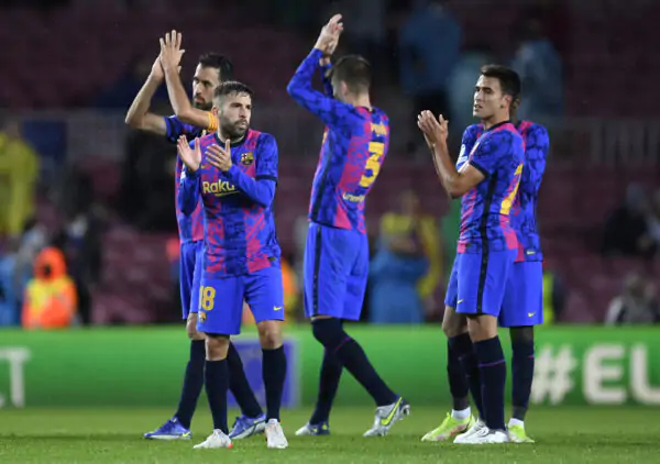 BARCELONA, SPAIN - NOVEMBER 23: Jordi Alba of FC Barcelona (2L) applauds the fans after the UEFA Champions League group E match between FC Barcelona and SL Benfica at Camp Nou on November 23, 2021 in Barcelona, Spain. (Photo by Alex Caparros/Getty Images)