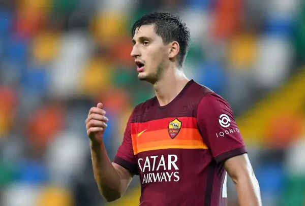 UDINE, ITALY - OCTOBER 03: Marash Kumbulla of AS Roma reacts during the Serie A match between Udinese Calcio and AS Roma at Dacia Arena on October 03, 2020 in Udine, Italy. (Photo by Alessandro Sabattini/Getty Images)