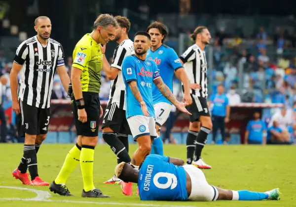 Napoli's Italian forward Lorenzo Insigne (C) gestures to referee Massimiliano Irrati (L) as Napoli's Nigerian forward Victor Osimhen lies on the ground during the Serie A football match beetween Napoli and Juventus at The Maradona Stadium in Naples on September 11, 2021. (Photo by Carlo Hermann / AFP) (Photo by CARLO HERMANN/AFP via Getty Images)