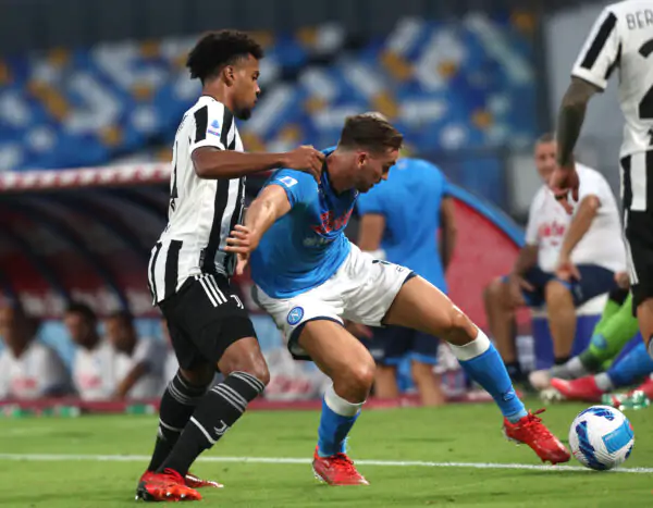 NAPLES, ITALY - SEPTEMBER 11: Weston Mckennie of Juventus competes for the ball with Fabian Ruiz of Napoli during the Serie A match between SSC Napoli and Juventus at Stadio Diego Armando Maradona on September 11, 2021 in Naples, Italy. (Photo by Maurizio Lagana/Getty Images)