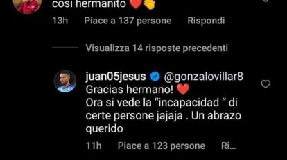 Il post è stato commentato dal suo ex compagno alla Roma Gonzalo Villar, che si è detto felice di vederlo cosi. Il difensore del Napoli ha risposto non risparmiando una piccola frecciatina nei confronti della sua ex squadra: “Gracias hermano. Ora si vede la incapacità di certe persone. Un abrazo querido”.