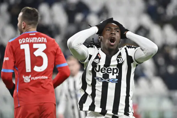 TURIN, ITALY - JANUARY 06: Moise Kean of Juventus reacts during the Serie A match between Juventus and SSC Napoli at Allianz Stadium on January 06, 2022 in Turin, Italy. (Photo by Stefano Guidi/Getty Images)