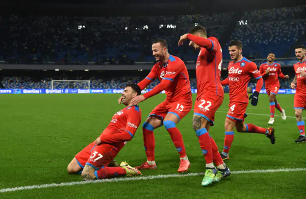 NAPLES, ITALY - JANUARY 09: Andrea Petagna of SSC Napoli celebrates with teammates Amir Rrahmani, Giovanni Di Lorenzo and Diego Demme after scoring their team's first goal during the Serie A match between SSC Napoli v UC Sampdoria at Stadio Diego Armando Maradona on January 09, 2022 in Naples, Italy. (Photo by Francesco Pecoraro/Getty Images)