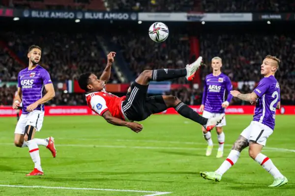 Feyenoord's Colombian forward Luis Sinisterra bicycle kicks the ball during the Dutch Eredivisie match between Feyenoord and AZ Alkmaar at Feyenoord Stadium de Kuip in Rotterdam on November 7, 2021. - Netherlands OUT (Photo by Pieter Stam de Jonge / ANP / AFP) / Netherlands OUT (Photo by PIETER STAM DE JONGE/ANP/AFP via Getty Images)