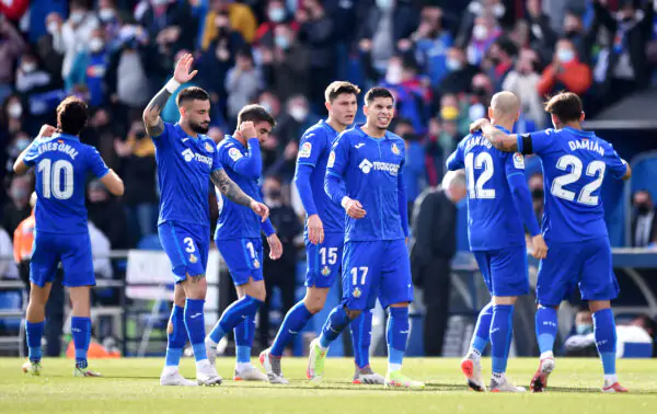 GETAFE, SPAIN - JANUARY 02: Getafe players celebrate their sides first goal scored by Enes Uenal during the LaLiga Santander match between Getafe CF and Real Madrid CF at Coliseum Alfonso Perez on January 02, 2022 in Getafe, Spain. (Photo by Denis Doyle/Getty Images)