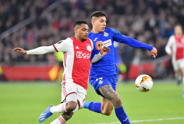 Ajax's Brazilian forward Danilo Pereira (L) fights for the ball with Getafe's Uruguayan defender Mathias Oliveira during the UEFA Europa League round of 32 second leg football match between Ajax Amsterdam and Getafe FC at the Johan Cruijff Arena stadium in Amsterdam on February 27, 2020. (Photo by JOHN THYS / AFP) (Photo by JOHN THYS/AFP via Getty Images)