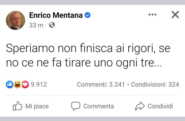Enrico Mentana, giornalista e tifosissimo dell’Inter, ha commentato con un post su Facebook ciò che sta accadendo nella finale di Supercoppa a San Siro tra i nerazzurri e la Juventus, con tanto di provocazione pungente rivolta alla classe arbitrale.