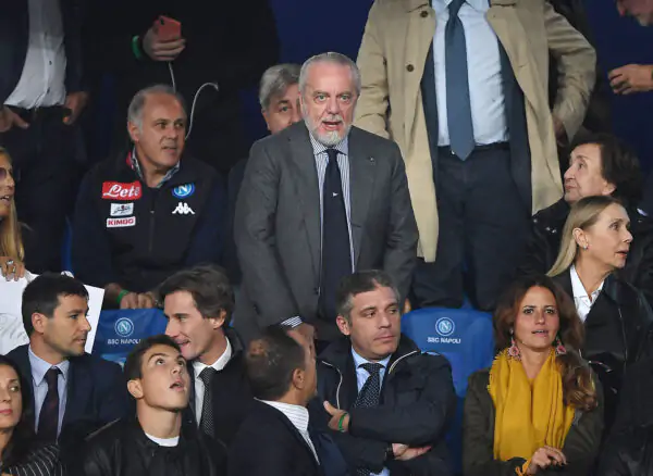 NAPLES, ITALY - NOVEMBER 06: Aurelio De Laurentiis, President of SSC Napoli, looks on prior to the Group C match of the UEFA Champions League between SSC Napoli and Paris Saint-Germain at Stadio San Paolo on November 6, 2018 in Naples, Italy. (Photo by Francesco Pecoraro/Getty Images)