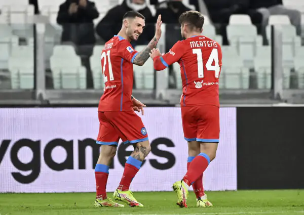 TURIN, ITALY - JANUARY 06: Matteo Politano congratulates Dries Mertens of Napoli as they celebrate his goal to make it 1-0 during the Serie A match between Juventus and SSC Napoli at Allianz Stadium on January 06, 2022 in Turin, Italy. (Photo by Stefano Guidi/Getty Images)