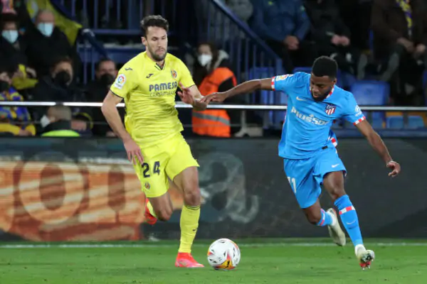 Villarreal's Spanish defender Alfonso Pedraza (L) vies with Atletico Madrid's French midfielder Thomas Lemar during the Spanish league football match between Villarreal CF and Club Atletico de Madrid at La Ceramica stadium in Vila-real on January 9, 2022. (Photo by JOSE JORDAN / AFP) (Photo by JOSE JORDAN/AFP via Getty Images)