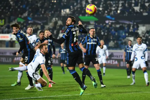 (From L) Atalanta's Dutch midfielder Marten de Roon, Inter Milan's Dutch defender Stefan de Vrij and Atalanta's Italian defender Giuseppe Pezzella go for the ball during the Italian Serie A football match between Atalanta and Inter on January 16, 2022 at the Azzuri d'Italia stadium in Bergamo. (Photo by Miguel MEDINA / AFP) (Photo by MIGUEL MEDINA/AFP via Getty Images)