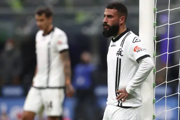 MILAN, ITALY - DECEMBER 01: Daniele Verde of Spezia Calcio shows his dejection during the Serie A match between FC Internazionale v Spezia Calcio at Stadio Giuseppe Meazza on December 01, 2021 in Milan, Italy. (Photo by Marco Luzzani/Getty Images)