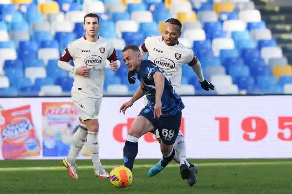 NAPLES, ITALY - JANUARY 23: Stanislav Lobotka of SSC Napoli vies with Joel Obi of US Salernitana during the Serie A match between SSC Napoli and US Salernitana at Stadio Diego Armando Maradona on January 23, 2022 in Naples, Italy. (Photo by Francesco Pecoraro/Getty Images)
