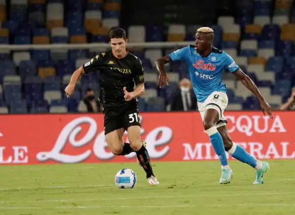 Mattia Caldara of Venezia and Victor Osimhenof Napoli in action during the match Serie A TIM between SSC Napoli Vs Venezia FC on August 22, 2021 in Naples at the Stadio Diego Armando Maradona. PUBLICATIONxINxGERxSUIxAUTxONLY Copyright: xMarcoxIoriox/xIPAx/xx 0