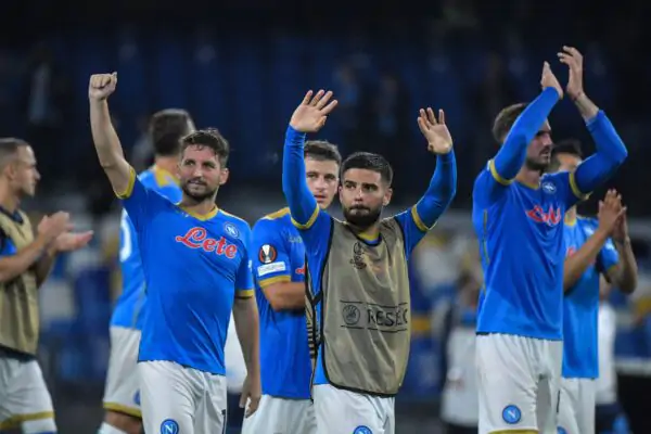 (From L) Napoli's Belgian forward Dries Mertens, Napoli's Italian forward Lorenzo Insigne and Napoli's Spanish midfielder Fabian Ruiz acknowledge fans at the end of the UEFA Europa League Group C Football match between Napoli and Legia Warsaw on October 21, 2021 at the Diego-Maradona stadium in Naples. (Photo by Tiziana FABI / AFP) (Photo by TIZIANA FABI/AFP via Getty Images)