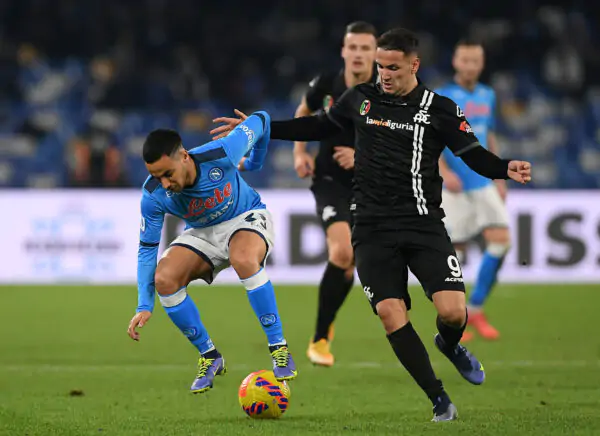 NAPLES, ITALY - DECEMBER 22: Rey Manaj of Spezia Calcio is tackled by Adam Ounas of SSC Napoli during the Serie A match between SSC Napoli and Spezia Calcio at Stadio Diego Armando Maradona on December 22, 2021 in Naples, Italy. (Photo by Francesco Pecoraro/Getty Images)