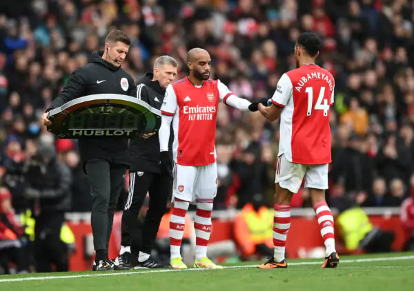 LONDON, ENGLAND - NOVEMBER 27: Alexandre Lacazette is substituted on to replace Pierre-Emerick Aubameyang of Arsenal during the Premier League match between Arsenal and Newcastle United at Emirates Stadium on November 27, 2021 in London, England. (Photo by Shaun Botterill/Getty Images)