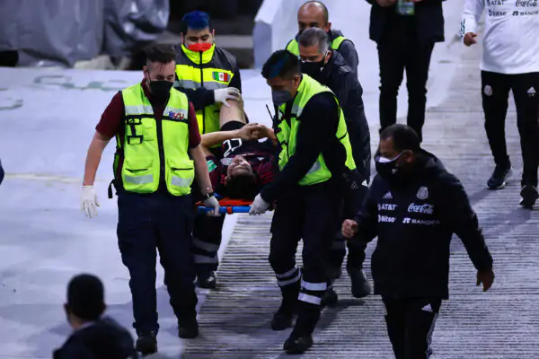 MEXICO CITY, MEXICO - FEBRUARY 02: Hirving Lozano of Mexico is stretchered off after an injury during the match between Mexico and Panama as part of the Concacaf 2022 FIFA World Cup Qualifier at Azteca Stadium on February 02, 2022 in Mexico City, Mexico. (Photo by Hector Vivas/Getty Images)