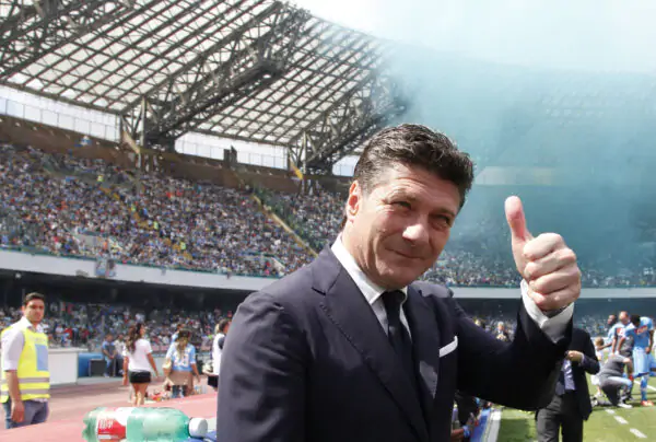 Napoli's coach Walter Mazzarri gestures before the start of the Serie A football match between SSC Napoli and AC Siena at the San Paolo Stadium in Naples on May 12, 2013. AFP PHOTO / CARLO HERMANN (Photo credit should read CARLO HERMANN/AFP via Getty Images)