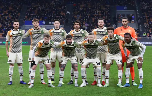 .MILAN, ITALY - JANUARY 22: Venezia FC players pose for a team photo prior to the Serie A match between FC Internazionale and Venezia FC at Stadio Giuseppe Meazza on January 22, 2022 in Milan, Italy. (Photo by Marco Luzzani/Getty Images)