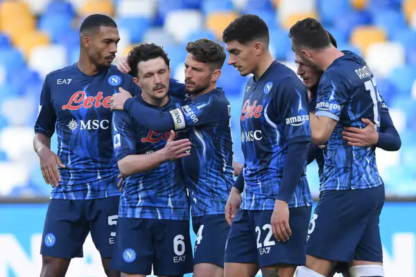 NAPLES, ITALY - JANUARY 23: Dries Mertens of SSC Napoli celebrates after scoring the 2-1 goal during the Serie A match between SSC Napoli and US Salernitana at Stadio Diego Armando Maradona on January 23, 2022 in Naples, Italy. (Photo by Francesco Pecoraro/Getty Images)