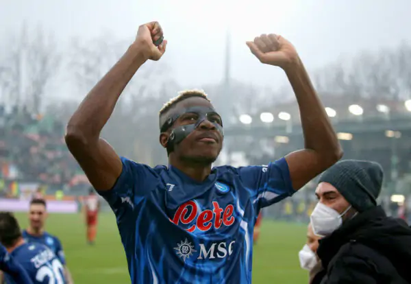 VENICE, ITALY - FEBRUARY 06: Victor Osimhen of Napoli celebrates after scoring his team's opening goal during the Serie A match between Venezia FC and SSC Napoli at Stadio Pier Luigi Penzo on February 06, 2022 in Venice, Italy. (Photo by Maurizio Lagana/Getty Images)