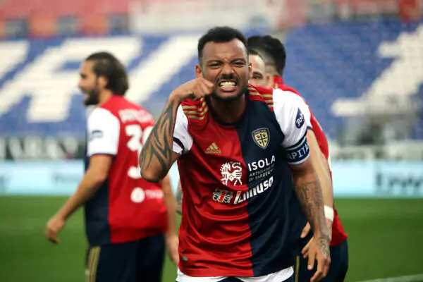 CAGLIARI, ITALY - JANUARY 31: Joao Pedro of Cagliari celebrates his goal 1-0 during the Serie A match between Cagliari Calcio and US Sassuolo at Sardegna Arena on January 31, 2021 in Cagliari, Italy. (Photo by Enrico Locci/Getty Images)