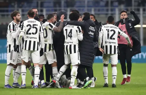 MILAN, ITALY - JANUARY 12: Weston McKennie of Juventus celebrates with team mates after scoring their side's first goal during the italian SuperCup match between FC Internazionale and Juventus at Stadio Giuseppe Meazza on January 12, 2022 in Milan, Italy. (Photo by Marco Luzzani/Getty Images)